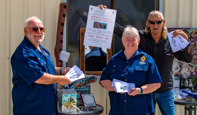 Gemfields RSL Sub Branch president Sue Ansford with husband Bevin (left) and Gemfields Community Thank You Day organiser Rev Baines (right). (Image: Sarah Duguid)