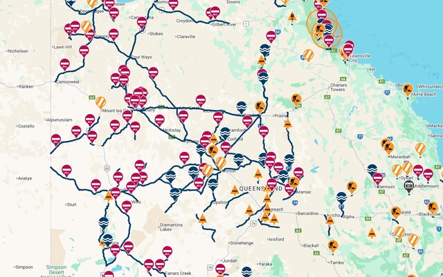 Multiple road closures are occurring in the Central West and North Queensland due to record rainfall. As of Wednesday morning, The Boulia-Dajarra Rd is the only all-access road open into Boulia, and the Bruce Highway is closed in the north near Cardwell. (QldTraffic)